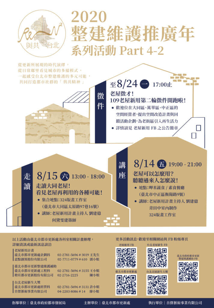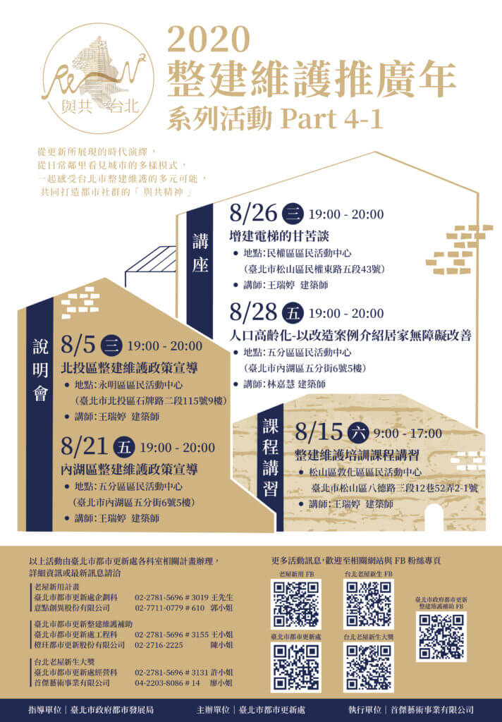 以改造案例介紹居家無障礙改善、整建維護政策宣導、整建維護培訓課程講習、大同、萬華、中正區老屋徵才、看見老屋再利用的各種可能
