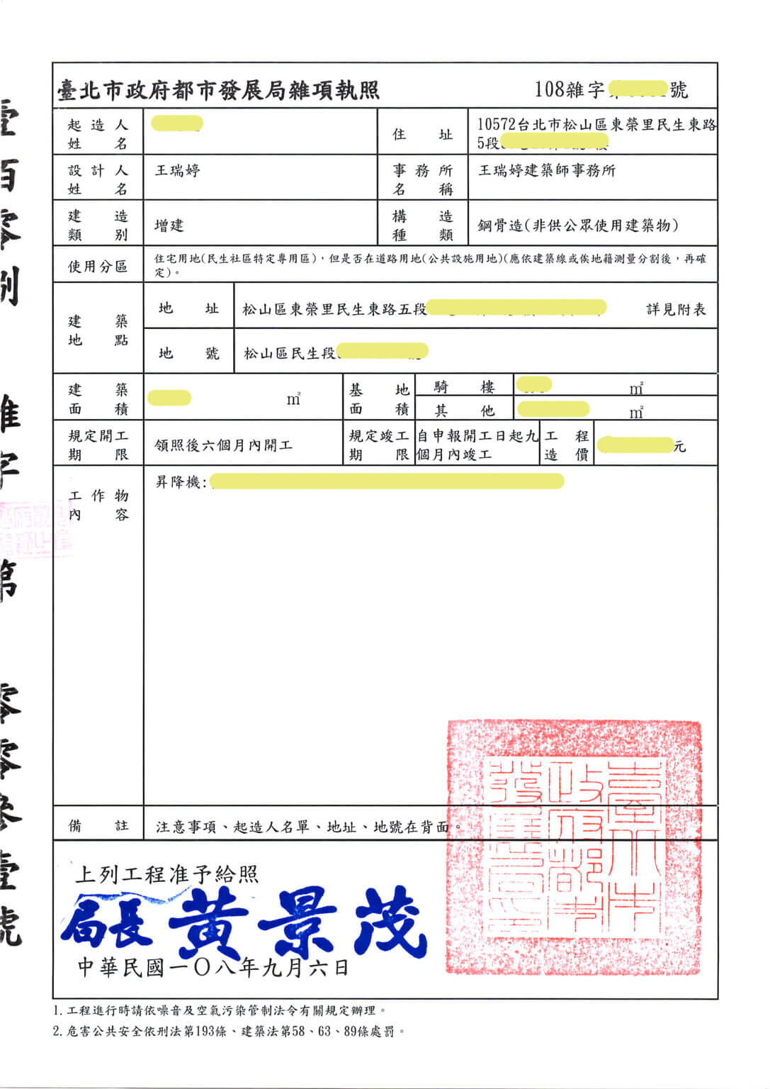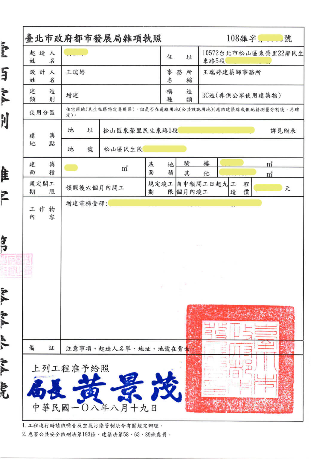 賀 本所 松山區民生東路電梯增建兩案 於 108年08月19日、108年9月6日領得雜項執照。