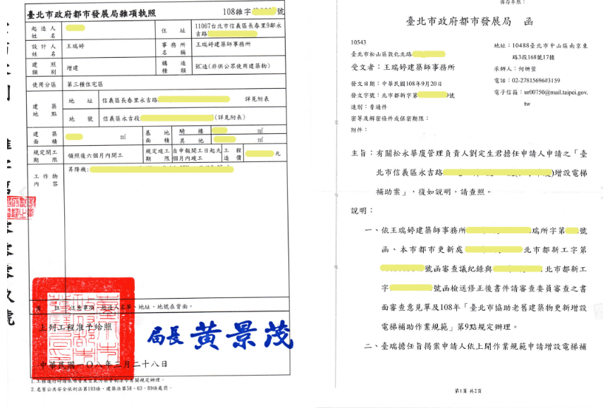 賀 本所 文山區羅斯福路電梯增建案 於 108年10月24日領得雜項執照。