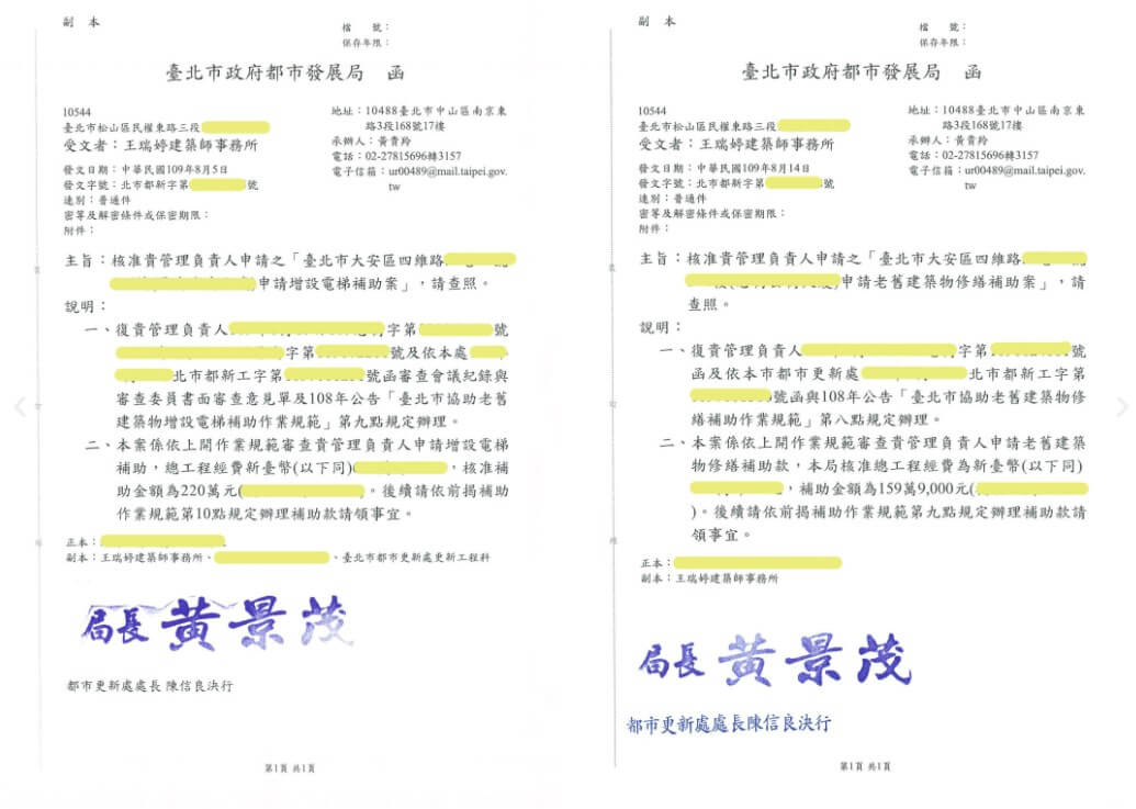 賀 本所 大安區四維路路電梯增建及外牆拉皮案 於 108年07月9日領得變更使用執照,並於109年8月5日核准「臺北市協助老舊建築物更新增設電梯補助款」,金額為220萬元整,於109年8月14日核准「臺北市協助老舊建築物修繕補助款」,金額為159萬9千元整。
