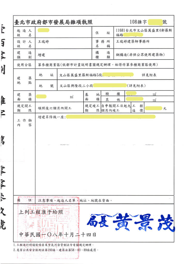 賀 本所 文山區羅斯福路電梯增建案 於 108年10月24日領得雜項執照。