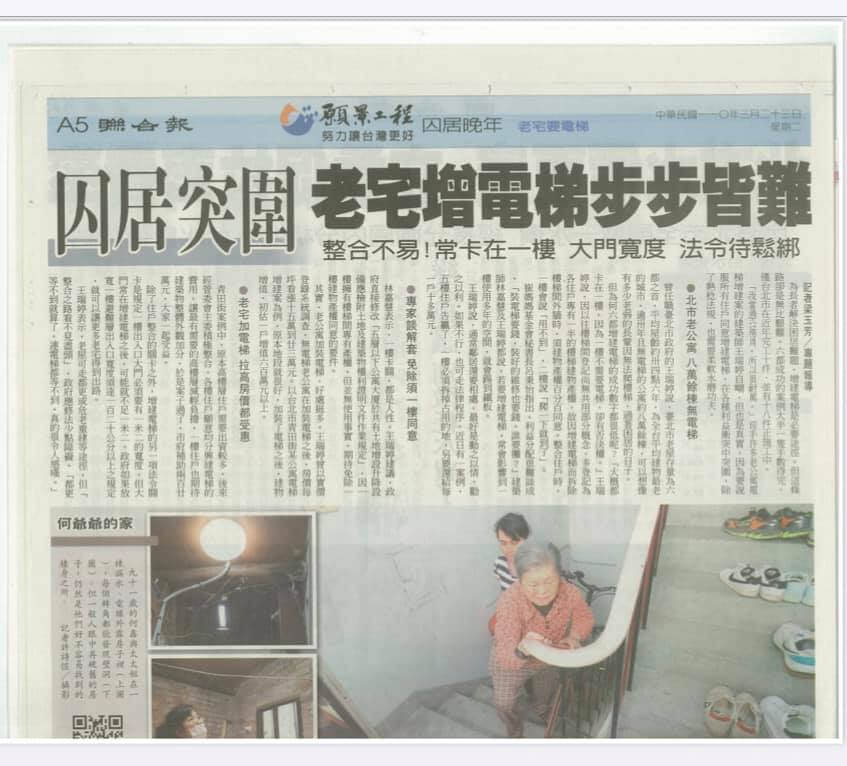 為長者解決困居難題,增建電梯是必要途徑。但這條路卻是無比艱難。六都成功的案例大半一隻手數得完,僅台北市在近年完工十件、並有十八件正施工中。